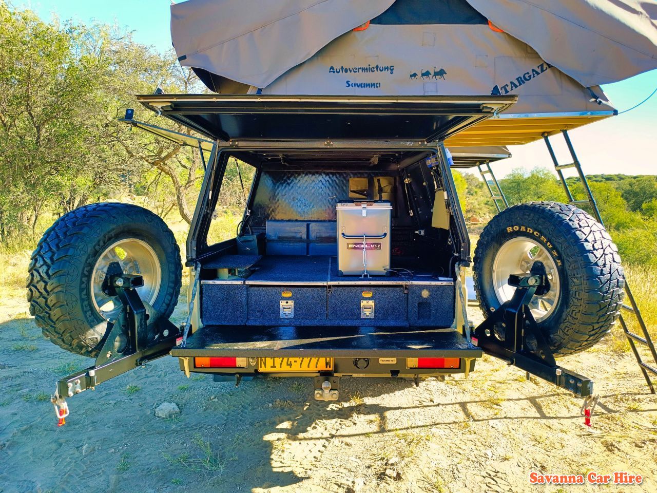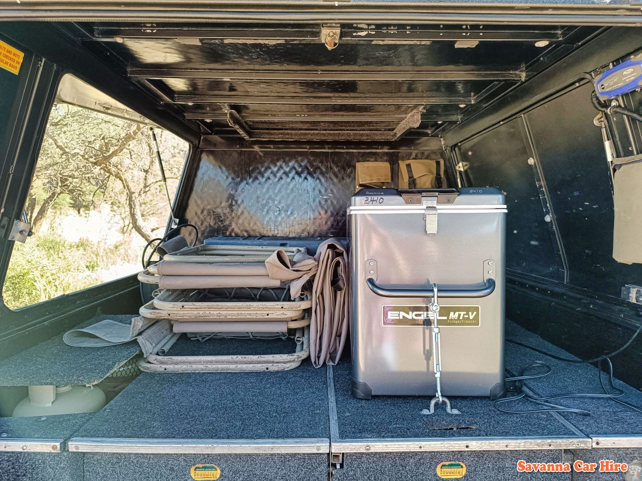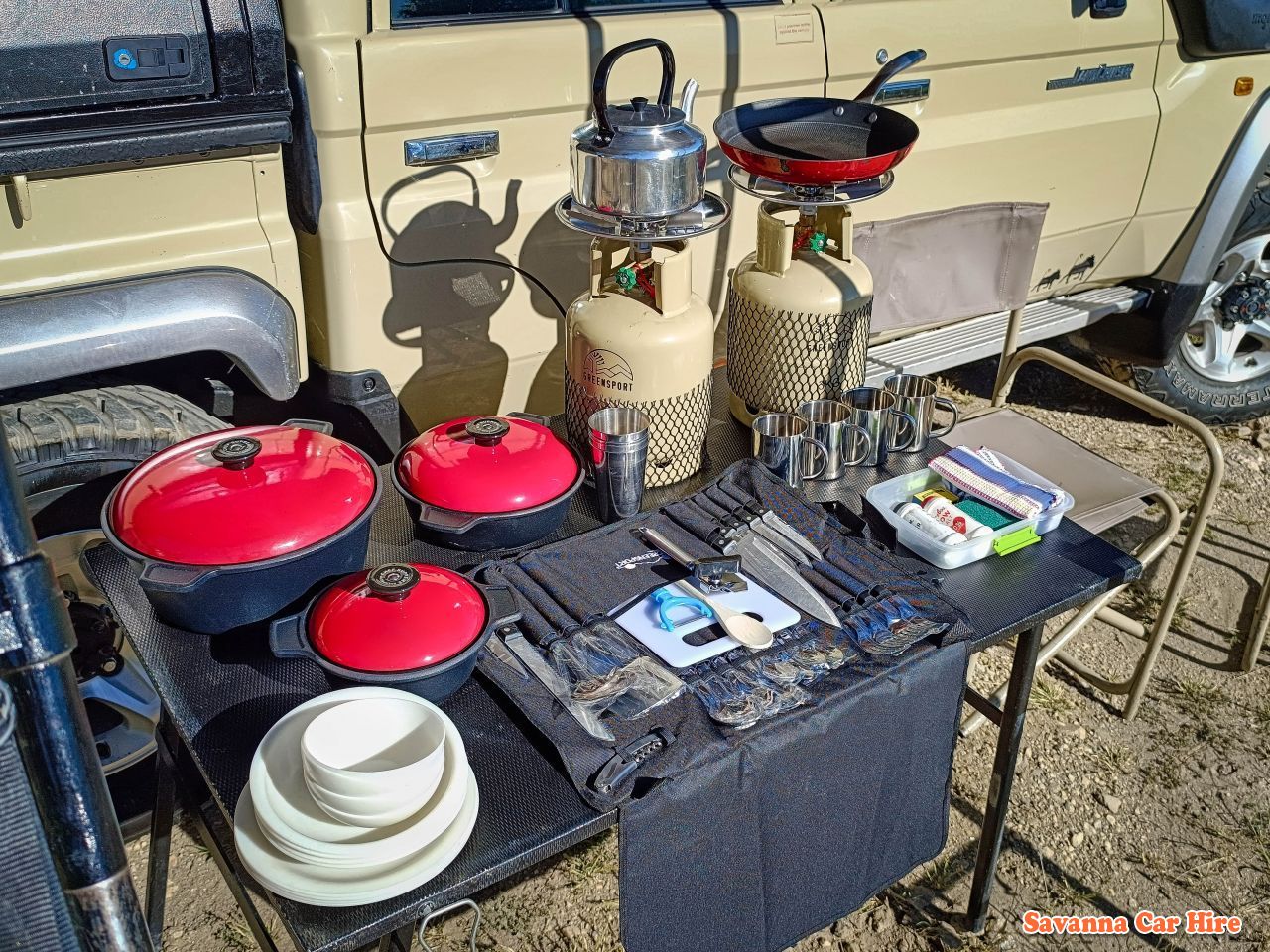 - 1x Roof tent (1.3m x 2.4m) with mattress - 1x 40l Engel Fridge with own Battery - 1x Table & 2 x Chairs - 2x Gas cylinder - 2x Single Cooker plate - 1x Barbeque grid - 1x 12v Lamp - 1x 45l build in Water Tank - 1x Bed sheet for the mattress (Sleeping bag with Pillow at N$ 30/day – must be booked) - 1x Shovel, 1x Kitchen box*KITCHEN BOX