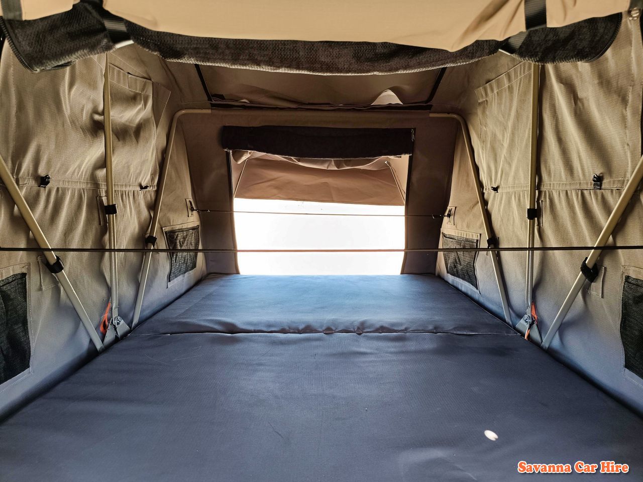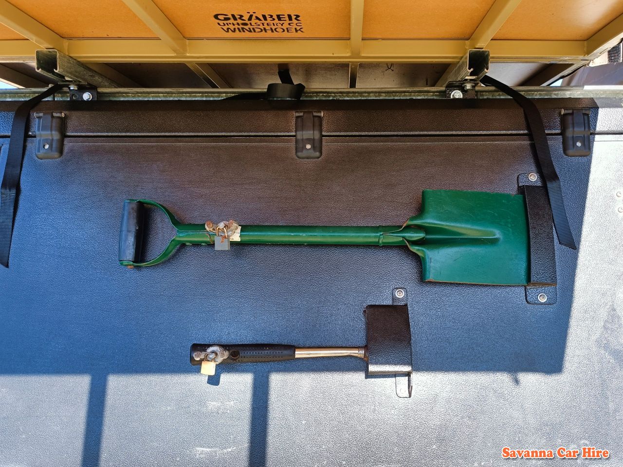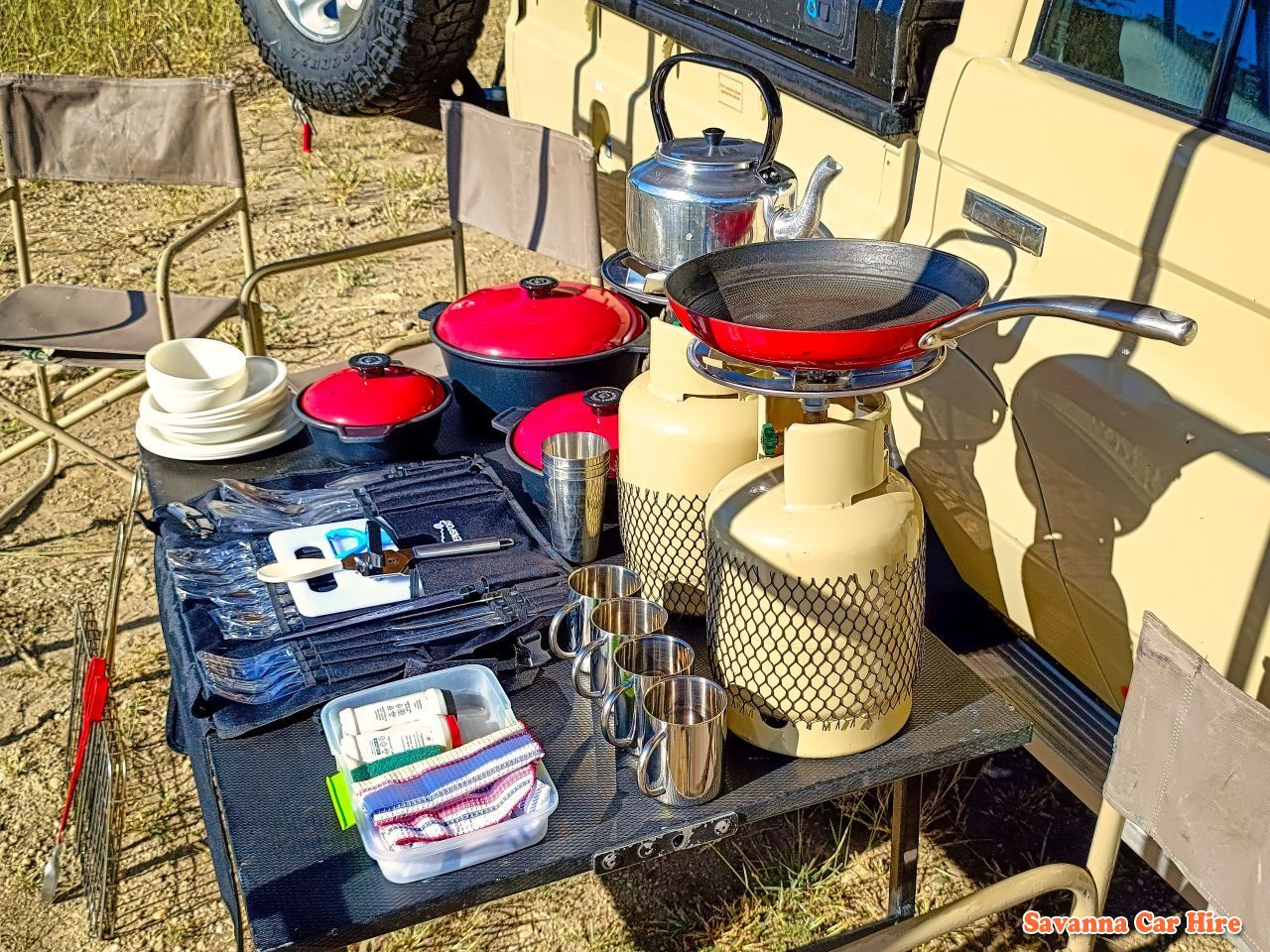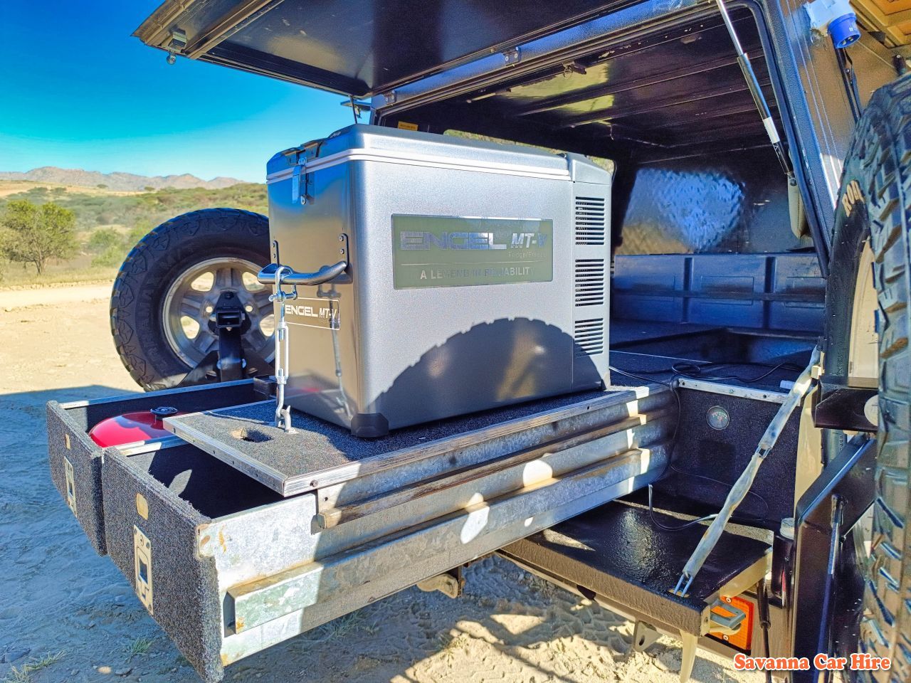 - 1x Roof tent (1.3m x 2.4m) with mattress - 1x 40l Engel Fridge with own Battery - 1x Table & 2 x Chairs - 2x Gas cylinder - 2x Single Cooker plate - 1x Barbeque grid - 1x 12v Lamp - 1x 45l build in Water Tank - 1x Bed sheet for the mattress (Sleeping bag with Pillow at N$ 30/day – must be booked) - 1x Shovel, 1x Kitchen box*KITCHEN BOX